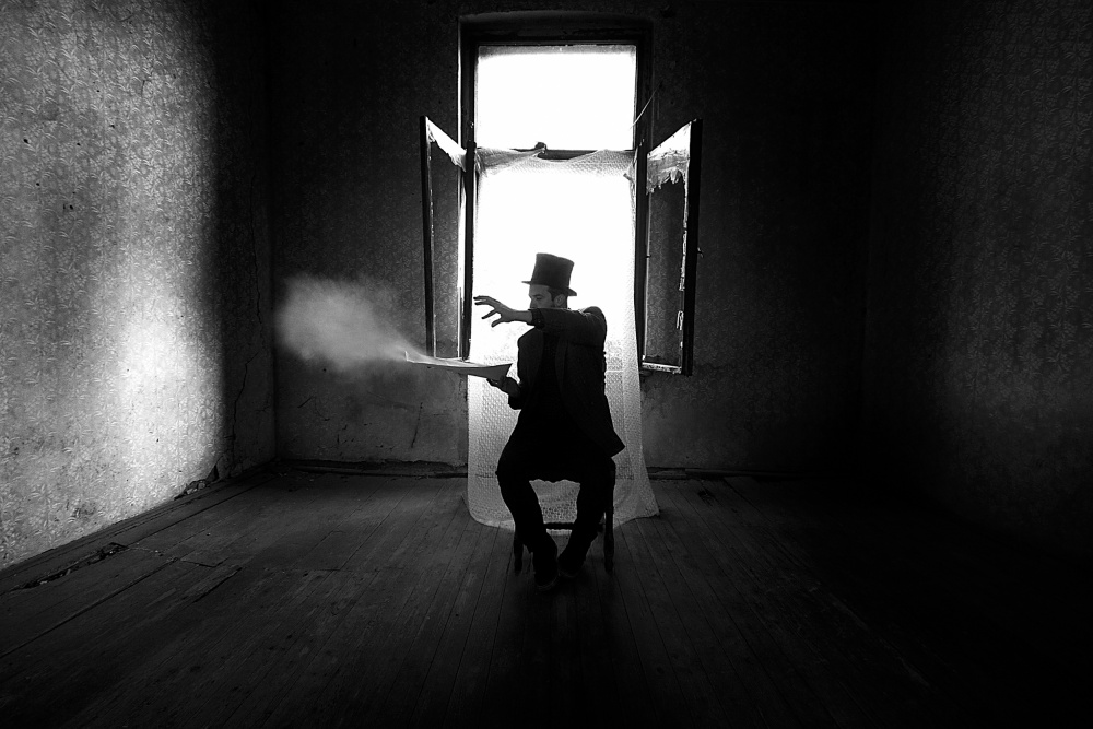 Most of the time, I work alone and I am the photographer and the model at the same time. That's why I always use a tripod. It can be difficult to find "models“ for my picture stories. People don't like posing, they don't have suitable clothes, they don't have time or they are just not in the mood. From time to time I manage to arrange some shooting sessions with my friends. Lucky Bobby is one of my friends who likes helping me and sometimes gives me great ideas, too. All my photos were shot with daylight and I always use a wide angle lens which is my favourite. Most of the photos were taken in abandoned houses because I associate that kind of place with the characters from the past. I am not into modern stuff. Furthermore, I am not interested in stereotypes either. Everything out of the ordinary, surreal and with a bit of dark atmosphere intrigues me. I am inspired by David Lynch, Edgar Alan Poe, Franceska Woodman, Jan Saudek, Ed Van der Elsken, Henry Cartier-Bresson, Robert Frank and Andy Warhol.