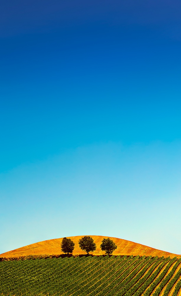 From the very first moment I saw that minimalism, my attention was attracted by the unusual upright format as well as the elegantly shaped, curved silhouette of the hill and the three trees. Their tops are just within the area spanned by the silhouette line. The warm colours and the light are simply perfect for me.