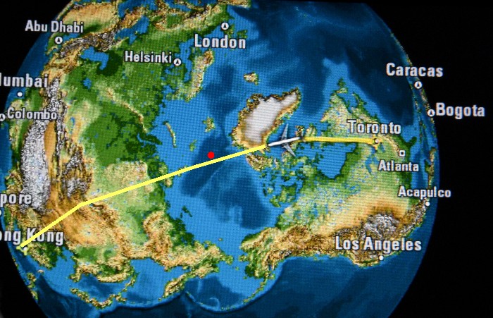 This was a very long (12,600 km) flight from Toronto to Hong Kong, crossed 12 time zones within only 15 hours, very exhausting indeed, but I was rewarded by fabulous window view, especially when flying over white Polar Arctic Region.