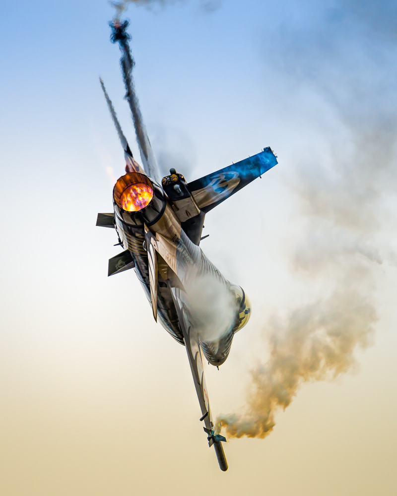 In this example, my post processing increases the amount of detail captured, not just in the plane itself but in the wig-tip smoke. Some local burning of shadow areas add a little more directional lighting from the left and, as I didn’t have the luxury of a blue sky, application of a split blue-yellow colour temperature grad top and bottom. I still would have liked a little more visibility of the cockpit, but I’m happy for now.