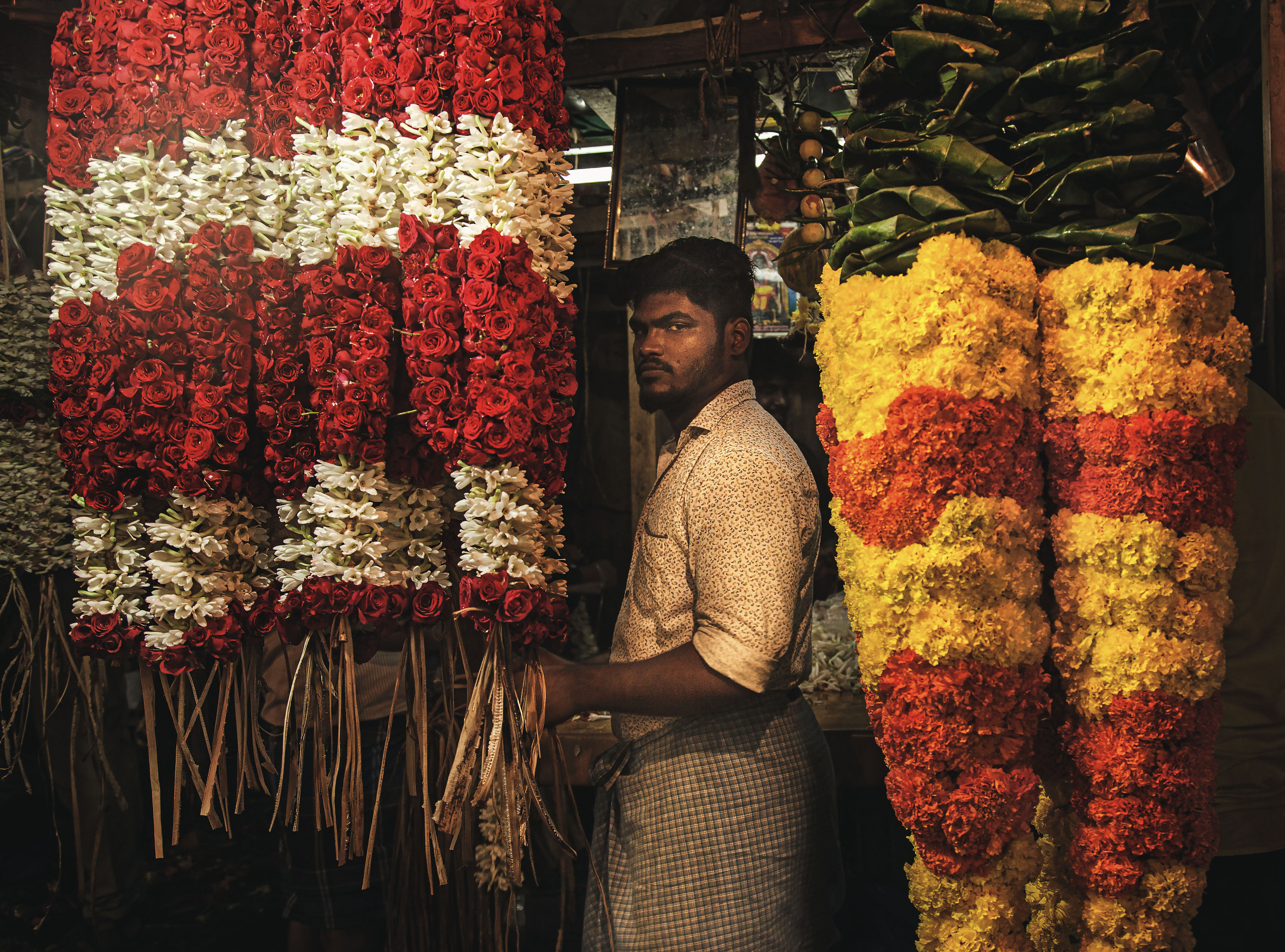 'Garlanded ' was taken in Chennai flower market. I love shooting in markets. This man was dwarfed by these enormous garlands, partly hidden, it was so amazing. It was a candid shot. I didn't speak to him. I was just moving through the market taking pictures wherever there was a good scene or light. Actually it was not one of the first pictures I edited.. I was not sure about the quality. I used a Canon 5D Mark III and an excellent 24 - 105 lens (so versatile).