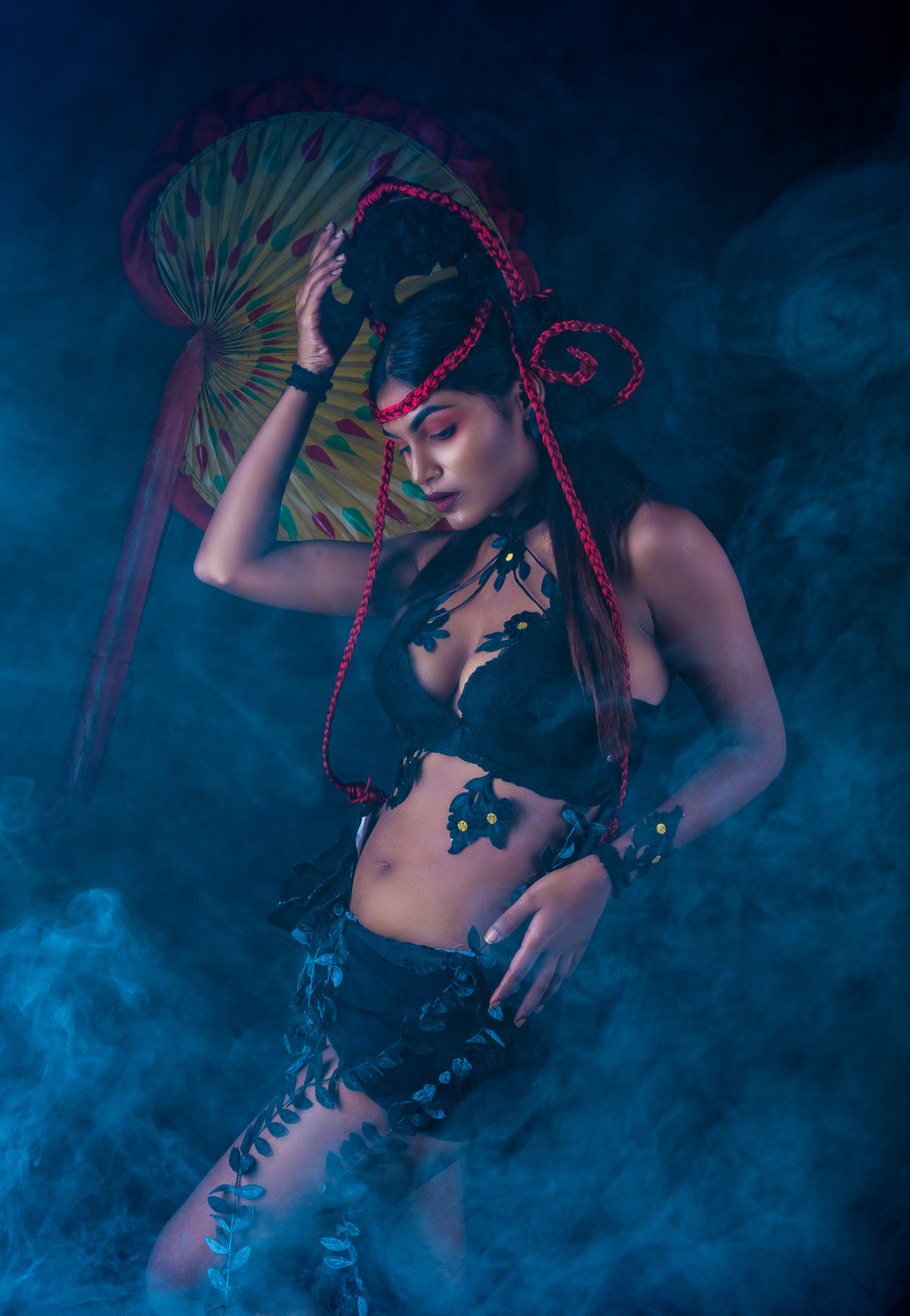 The subject’s arms are also important in maintaining the overall S-curve or hourglass shape. For example, if the arms are facing downwards, it is important that the elbows are slightly bent so that there is a gap between them and the waist, else the shaping effect is lost. Symmetrical shaping of the arms (as in both hands on hips or above the head) is often effective but, taking the concept of contrapposto a little further, posing the arms asymmetrically (one hand on the hip, the other stroking the hair) can give a wonderful sense of visual balance, movement, sensuality or drama, as in Michaelangelo’s David.