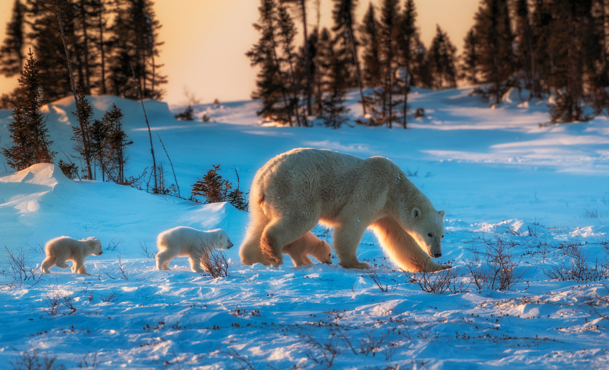 ‘Follow Mom-Three cubs follow mom bear in evening'